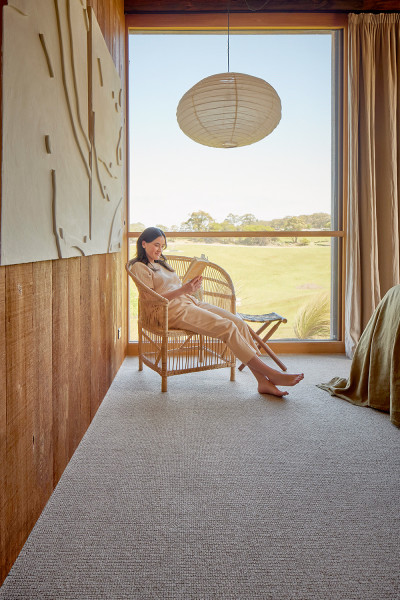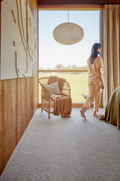 The flooring is finished in Hycraft’s Luxury Living in 550 Sumptuous, a premium chunky loop pile wool carpet that brings an added sense of softness and warmth underfoot. Its neutral tone enhances the room’s natural palette, while the dense wool fibres help regulate temperature and absorb sound - ideal for creating a quiet, calming bedroom retreat. Made from renewable New Zealand wool, this carpet offers luxury that feels as good as it looks - durable, breathable, and crafted for long-lasting comfort.