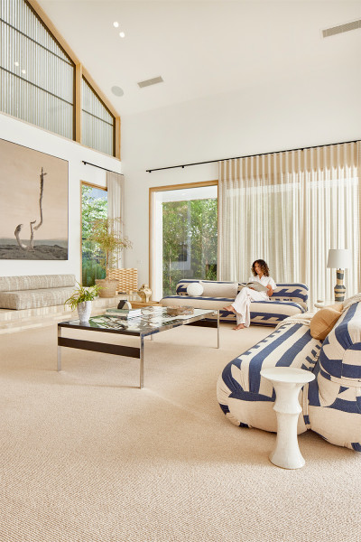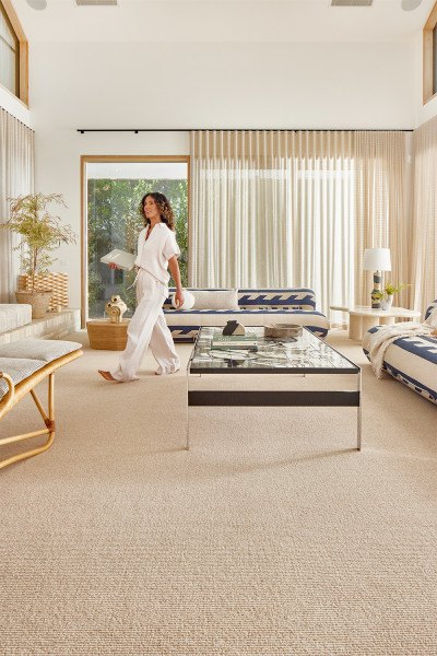 The space is finished with Hycraft’s Caribbean in 530 Bahamas, a loop pile wool carpet that brings softness and timeless appeal. Its sandy, natural tone complements the interior palette, while the wool loop texture adds warmth and comfort underfoot. Made from quality wool, it’s naturally insulating, hard wearing, and easy to live with-making it an ideal choice for family living with a design-conscious edge.