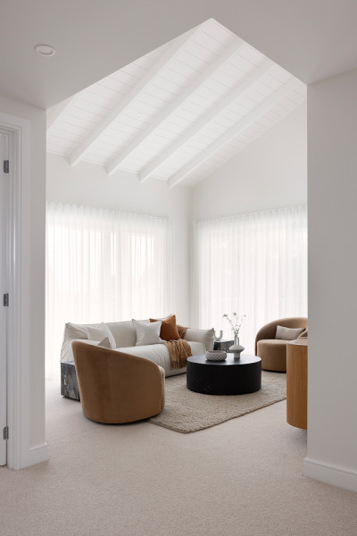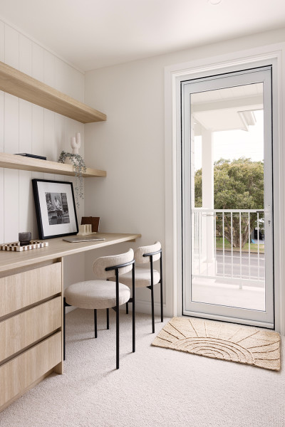 The design pairs high-end finishes with a relaxed, beachside style, bringing out the best in this warm, welcoming space. The open living areas and hallways feature engineered timber from the Corsica range in 510 Coastal Oak in both the original and Chevron styles. The unique Chevron design elevates the space, and the natural grain of the timber enhances the home’s coastal character.