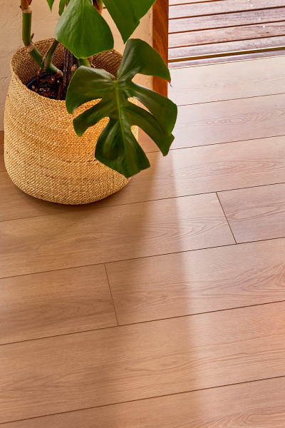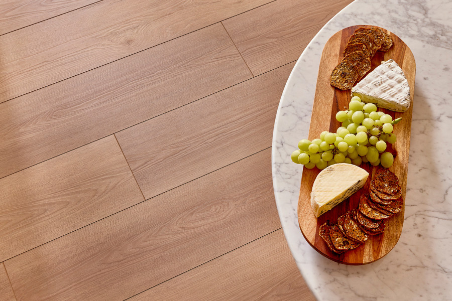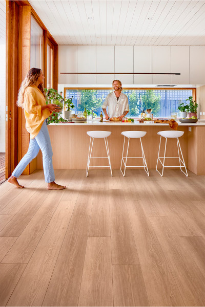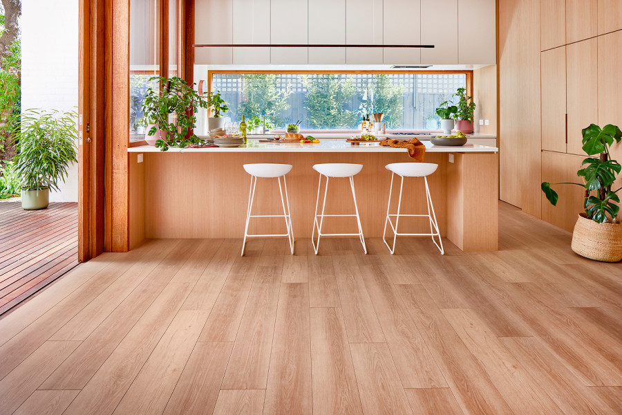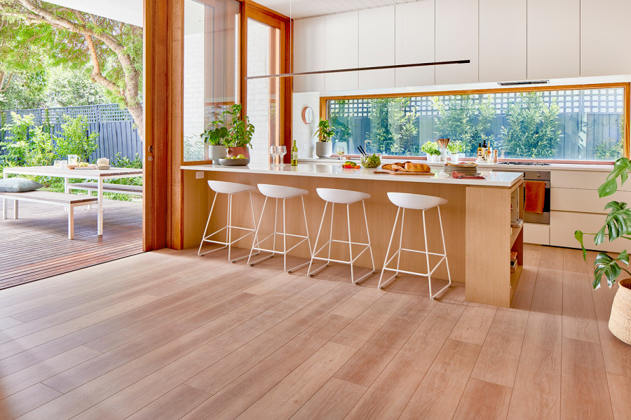 The wide planks and subtle oak-inspired grain of Vista 1500 add texture and depth underfoot, complementing the surrounding timber cabinetry and crisp white surfaces. Large windows and sliding doors frame lush greenery outside, while natural light enhances the floor’s golden hue, reinforcing the room’s relaxed, sun-soaked aesthetic. Whether it’s casual lunches or evening drinks around the island bench, this space is built for connection - combining comfort, practicality and authentic style with flooring that’s durable, low maintenance and made to last.