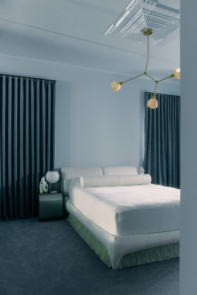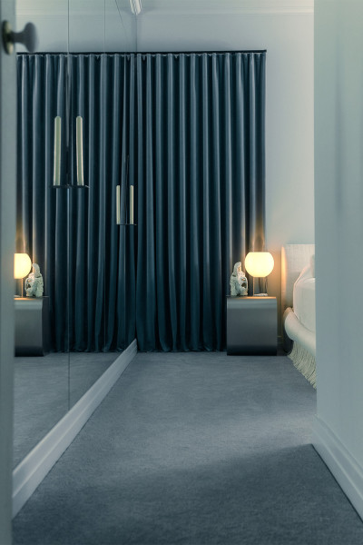 For the bedroom, Kelly selected triexta carpet Winter Charm in 835 Seafront, a soft blue colour, that harmonises with the blue walls, curtains, and vibrant colour-drenched palette.