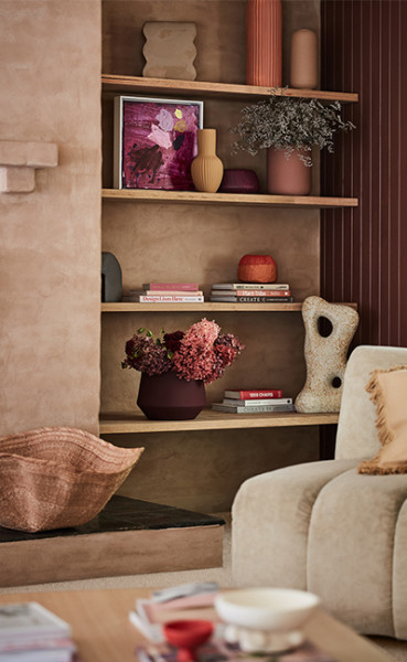 A natural-coloured wool loop carpet, like Chatsworth in colour 545 Shrewsbury, beautifully enhances the living room’s aesthetic, grounding the palette of blush pinks, berry tones, and warm rusts. Its soft texture invites bare feet, adding a layer of comfort that complements the plush cream sofa. The looped design introduces subtle patterns, creating visual interest without overwhelming the serene atmosphere. This carpet not only harmonises with the earthy hues of the room but also fosters an inviting environment perfect for relaxation and connection.