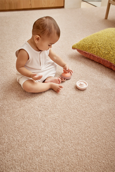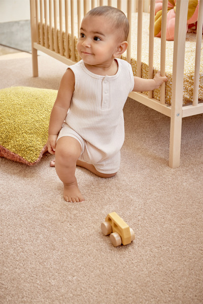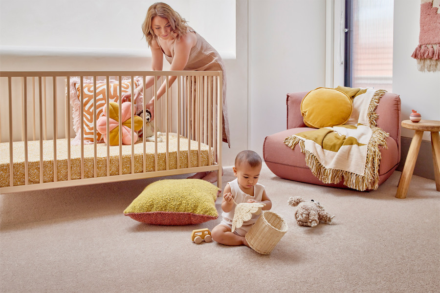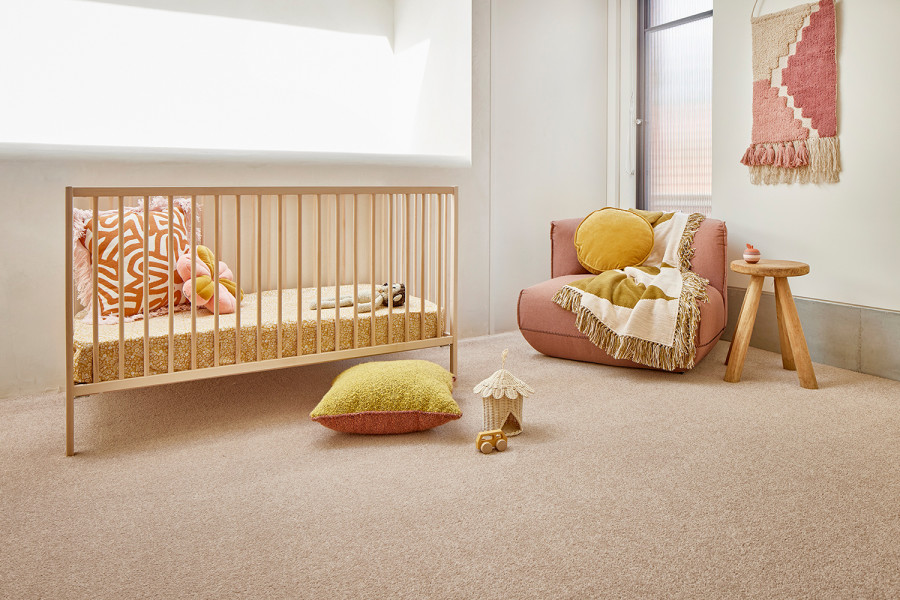 At the heart of the room is our Luxford in 535 Croissant, a soft cut pile carpet that brings softness, warmth and peace of mind to the space. Its gentle tone complements the nursery’s neutral aesthetic, while the Triexta fibre offers exceptional durability and permanent built-in stain resistance - ideal for growing families. The luxurious feel underfoot creates a soothing environment for little ones to crawl, play and rest, supporting a space that’s thoughtfully designed for everyday life and quiet, meaningful moments.