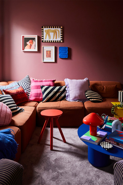 The living room features plum-coloured walls that create a snug and warm setting. Bree chose this deeper hue to enhance the cosy feel, opting for Dulux ‘Lampoon’. The foundation of the space is the rose-pink rug, which adds a soft touch underfoot and complements the walls. The stain-resistant triexta carpet, Winter Charm, is a lifesaver for movie nights, popcorn and chocolate.