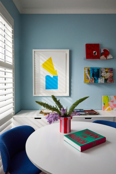 Bree’s studio, where she works on her interior design projects, is cheerful and bright. The same mauve rug from the living room, sky blue walls in Dulux colour ‘Salt Spray’ and natural light make for an inspiring, yet fresh workspace.