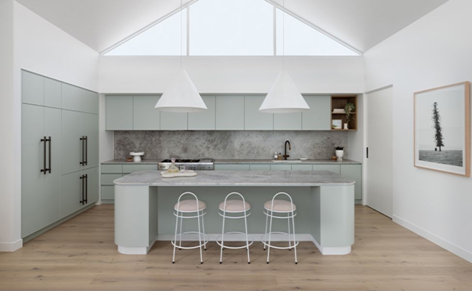 The use of engineered timber Corsica Oak in the colour 510 Coastal Oak provides a bright and neutral foundation for the array of colours, artwork, and Scandinavian shapes in Nat’s light-filled home. Throughout the stunning open-plan kitchen, the muted green joinery is complemented by the striking tundra marble countertop and the natural grey knots within the Corsica Oak engineered timber.