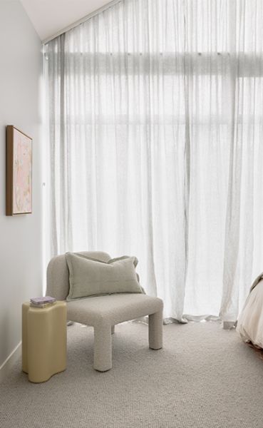 For the bedrooms, Nat chose Tranquil Texture in colour 713 Summer Rain, a light grey textured wool carpet, to accompany the neutral bed linen and curtains in the kids' rooms, but also to allow for the muted pink in the primary bedroom to shine.