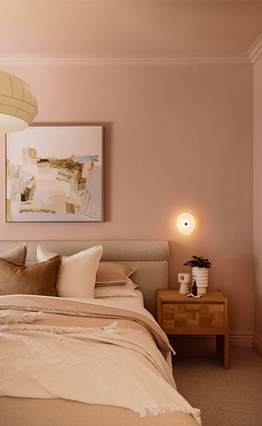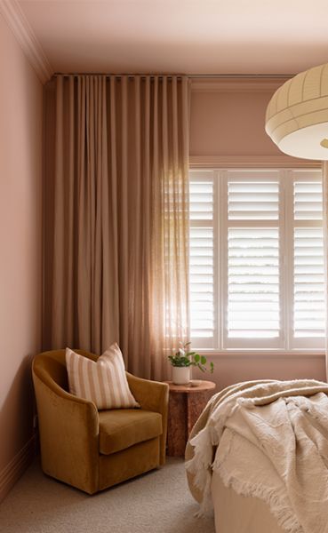 The primary bedroom is all about colour and texture. With the warm pink paint colour spanning the walls and ceiling, the bedroom feels inviting and homely. Utilising texture and natural materials, Nat has featured velvet in the cushions and the occasional chair, linen curtains, a mohair throw and wool carpet to create this cosy atmosphere.