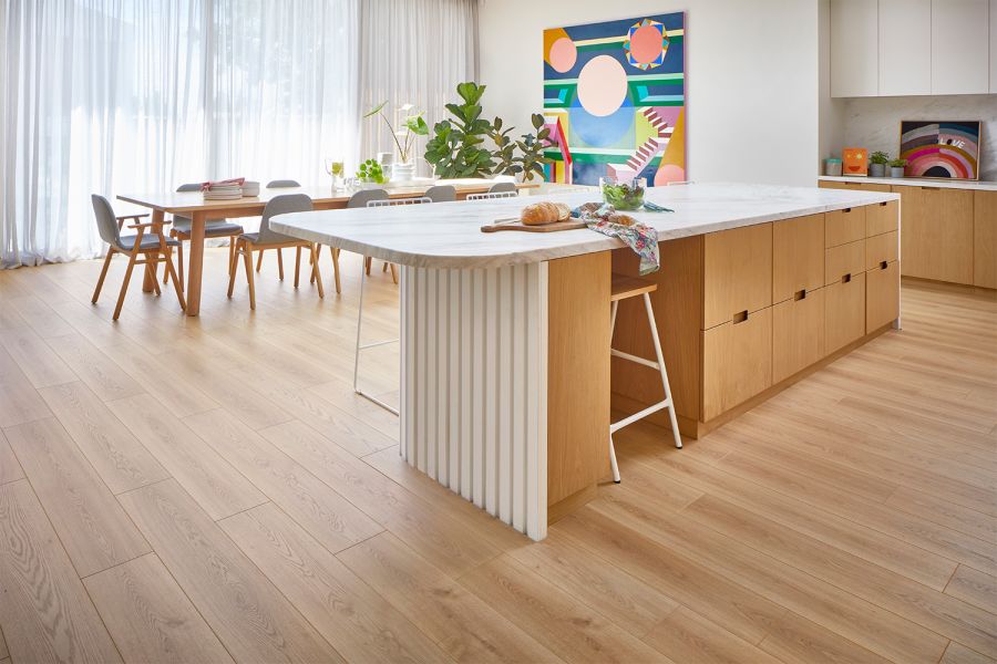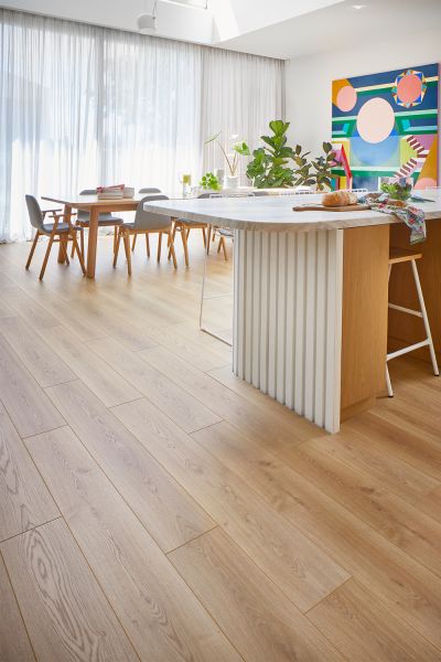 Legacy, a durable timber look laminate, ties the feel of the space together. Manufactured in Europe, and selected in mid-coloured Harvest Oak, this hard flooring replicates the natural beauty, colour and graining of real timber. A great choice for busy, spill prone household areas, wear, stain and fade resistant Legacy comes with an Aquashield™ protective layer for real peace of mind.