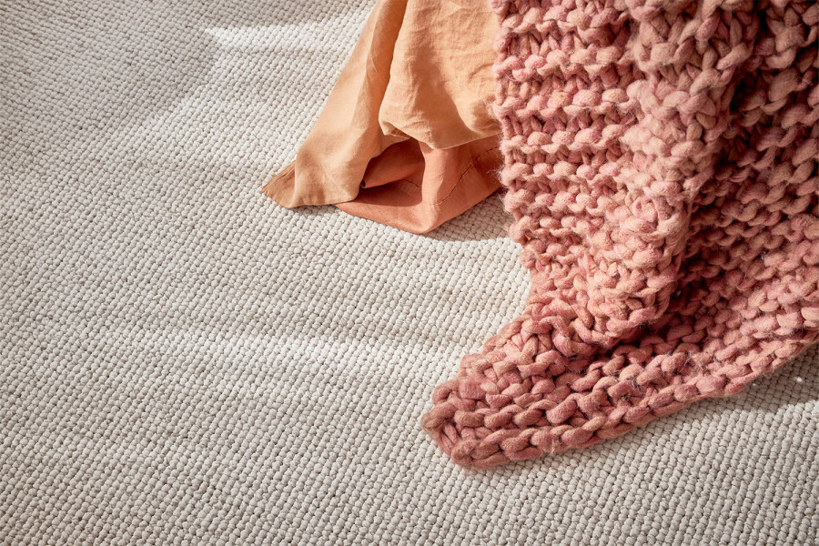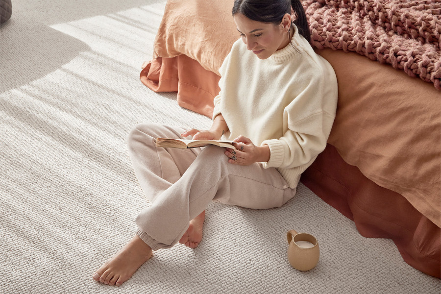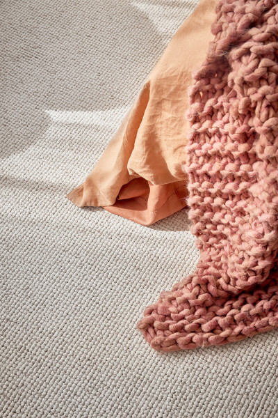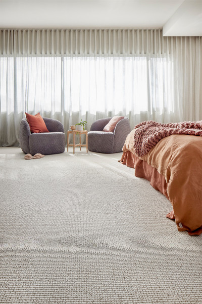The floor is finished in Otway Lodge in 500 Cascade, a sophisticated solution dyed nylon (SDN) carpet known for its resilience and soft loop pile texture. Its subtle tonal variation adds gentle depth, while the light neutral shade enhances the room’s airy, tranquil feel. Designed to stand up to everyday living, Otway Lodge offers long-lasting colourfastness, stain resistance, and comfort, making it an ideal choice for modern bedrooms. In this space, it ties together design and durability – elevating a simple sleep space into something truly restful.