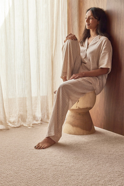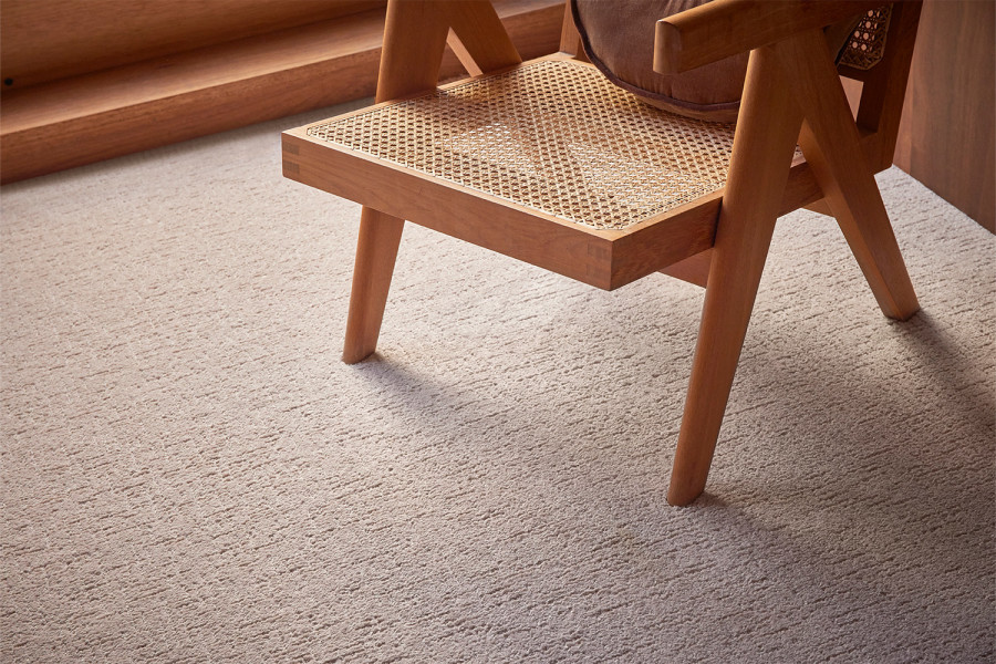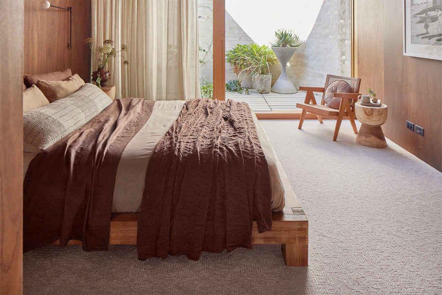 The floor is finished in Natural Artistry in 505 Moon Shine, a textured cut and loop carpet made from innovative Triexta fibre. The sculpted texture introduces subtle pattern and interest, while the soft grey tone blends effortlessly with the room’s natural materials. Known for its luxurious feel, Triexta also delivers outstanding durability and permanent, built-in stain resistance - no treatments required. It's a carpet choice that supports both everyday practicality and long-lasting comfort, perfectly suited to restful spaces like this tranquil bedroom.