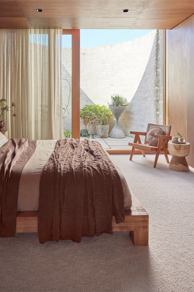 Layered with natural textures and a soft, tonal palette, this bedroom is designed to evoke a sense of calm and quiet comfort. Timber walls and earthy linens add warmth and depth, while soft light filters through sheer curtains, enhancing the overall sense of stillness and retreat.