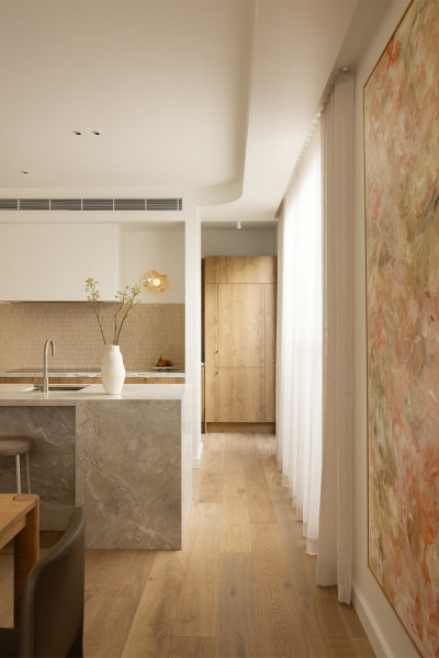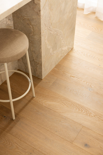 Chateau Oak engineered timber in 565 Elm Oak runs throughout the kitchen, dining, hallway and living, tying spaces together, softening acoustics and warming the palette.