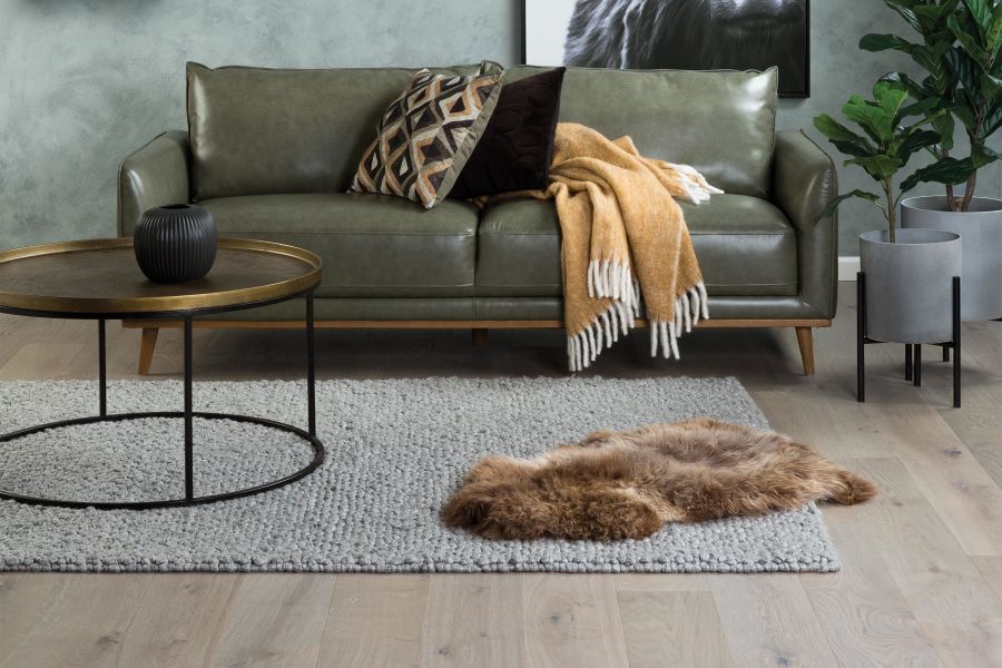Industrial meets modern with an eclectic mix of furniture and accessories, bringing warmth to this living room. Villa Silver Finch is a beautiful oak timber flooring that creates a focal point with unique natural patterns on each board. Complimented with contrasting cool greys and plants bring a sense of nature and energy to the space. Paint effects provided inspiration for this shot, creating texture and dimension.