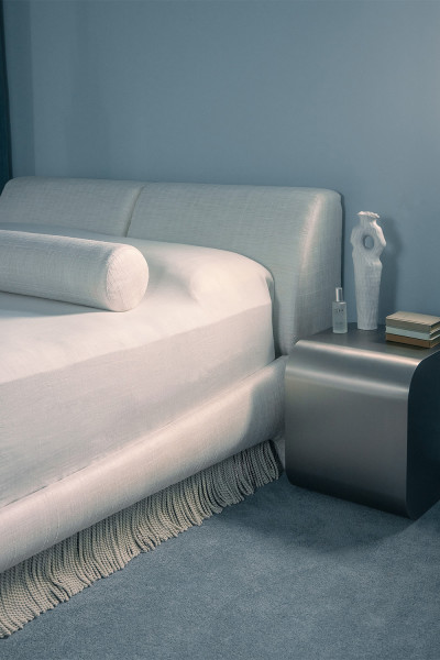 The space combines layered textures and carefully curated accents, including silver bedside tables, organic ceramic sculptures, and plush furnishings, to create a serene and inviting atmosphere.
