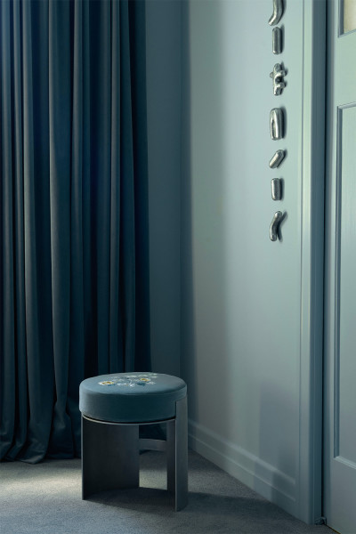 For the bedroom, Kelly selected triexta carpet Winter Charm in 835 Seafront, a soft blue colour, that harmonises with the blue walls, curtains, and vibrant colour-drenched palette.