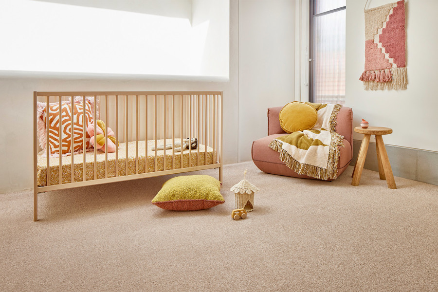 At the centre of the room is our Regal Charm carpet in the colour Soft Suede 550 — a dense cut pile that feels incredibly soft and warm underfoot. Its gentle, neutral tone blends beautifully with the nursery’s calming palette.