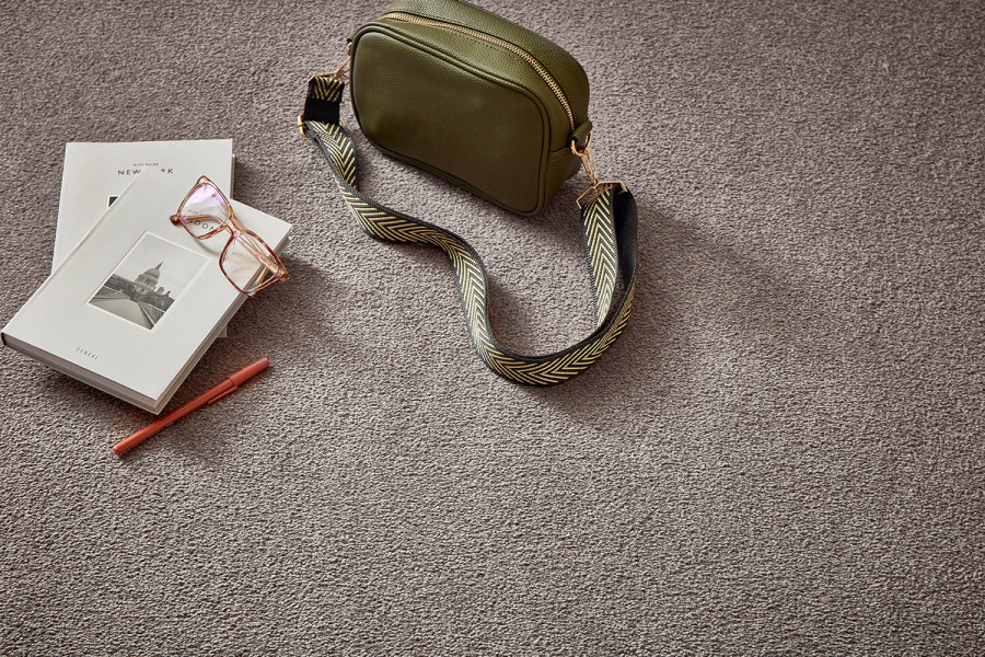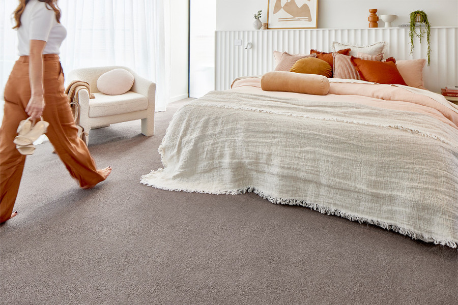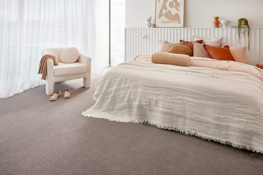 Peal Bay in Truffle 730 complements the space with a low-height cut pile and elegant mid-grey tone. This carpet pairs beautifully with surrounding materials. It offers a resilient surface, perfect for high-use areas like master suites.